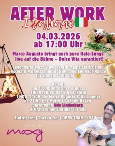 • ab 18:30: legendärer Moxy Schwenkgrill mit Salsiccia, Rucola und Parmesan